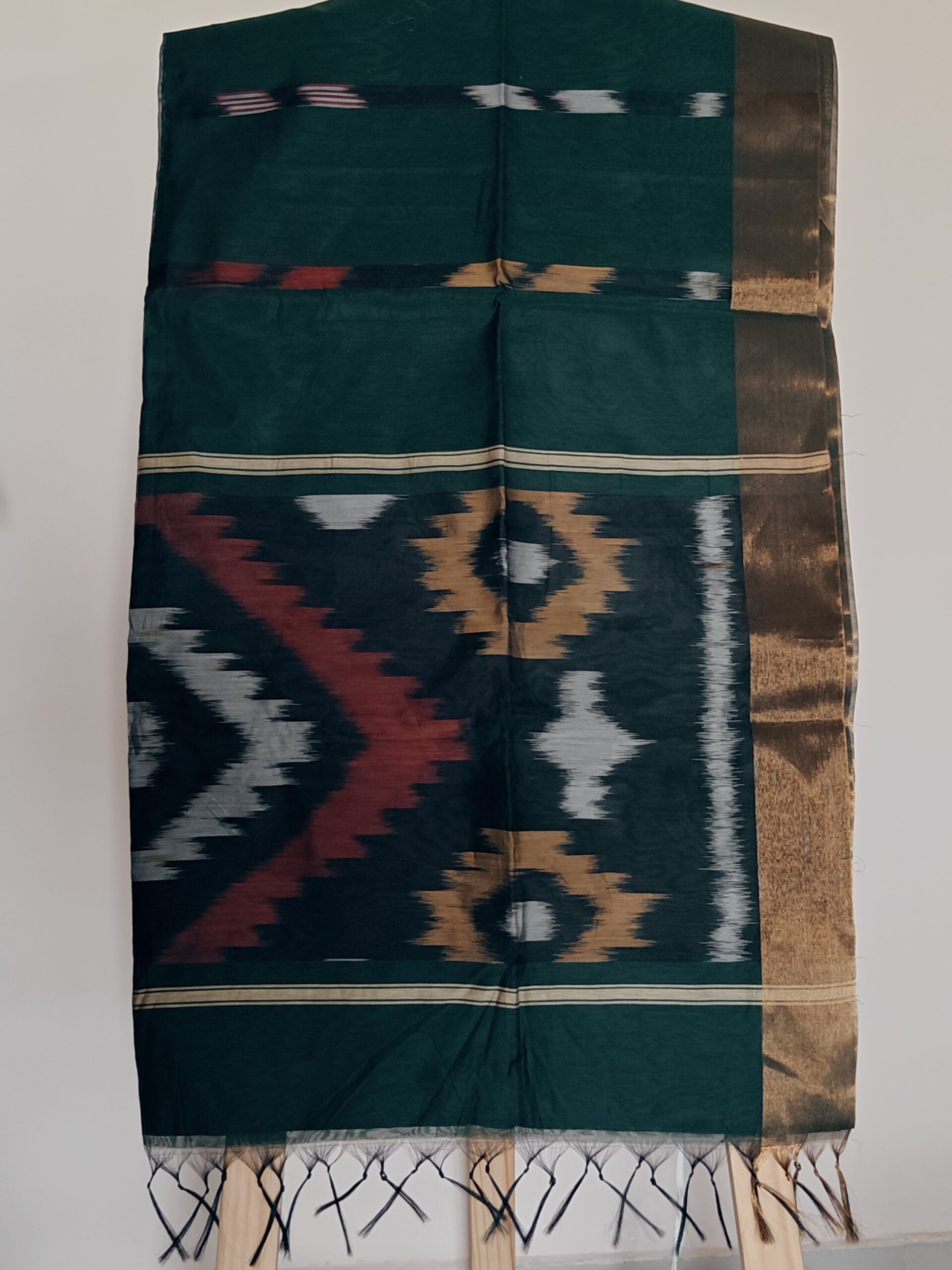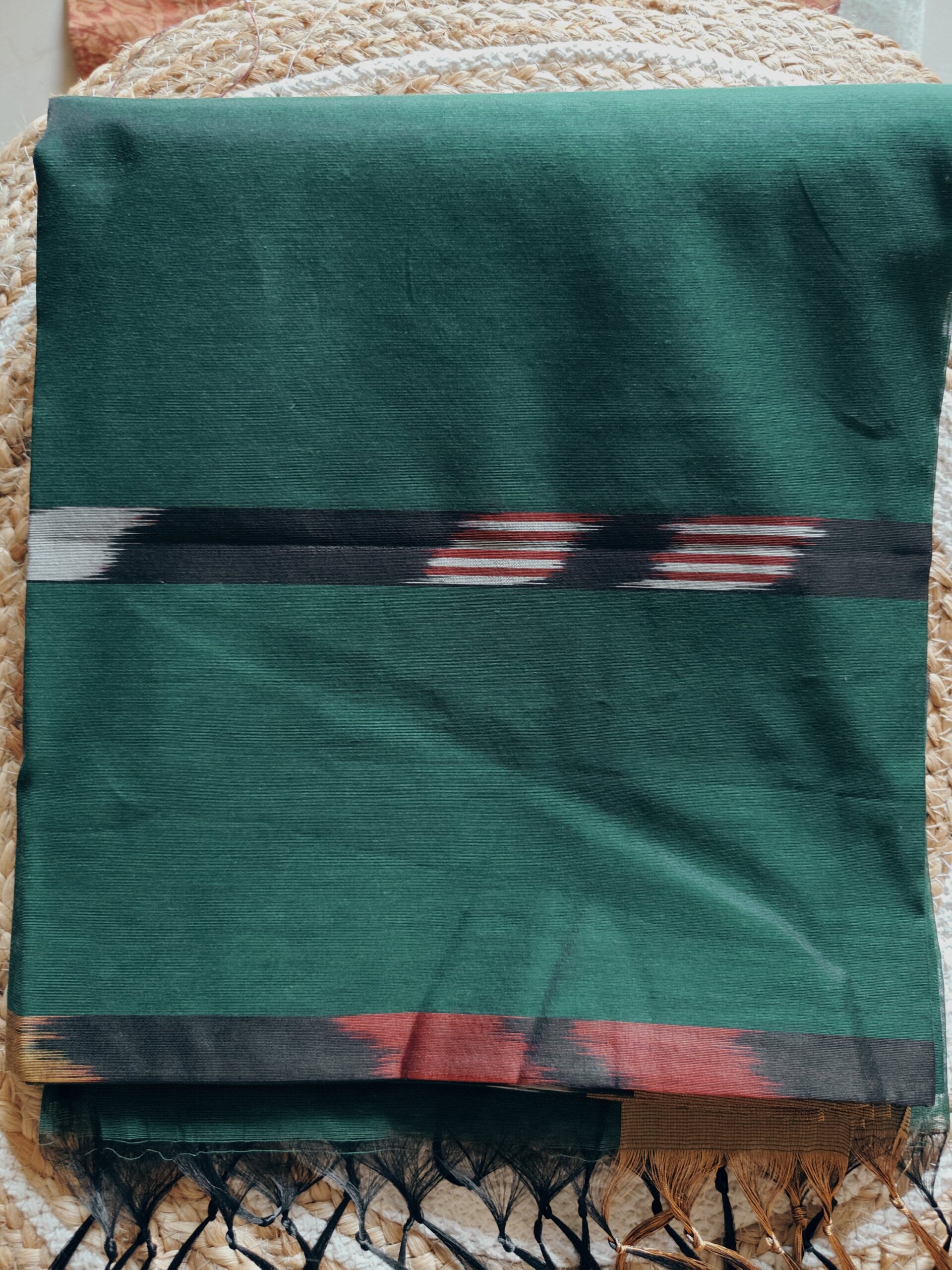 Bottle Green Ikat Pattern Powerloom Saree with Gold Zari Border