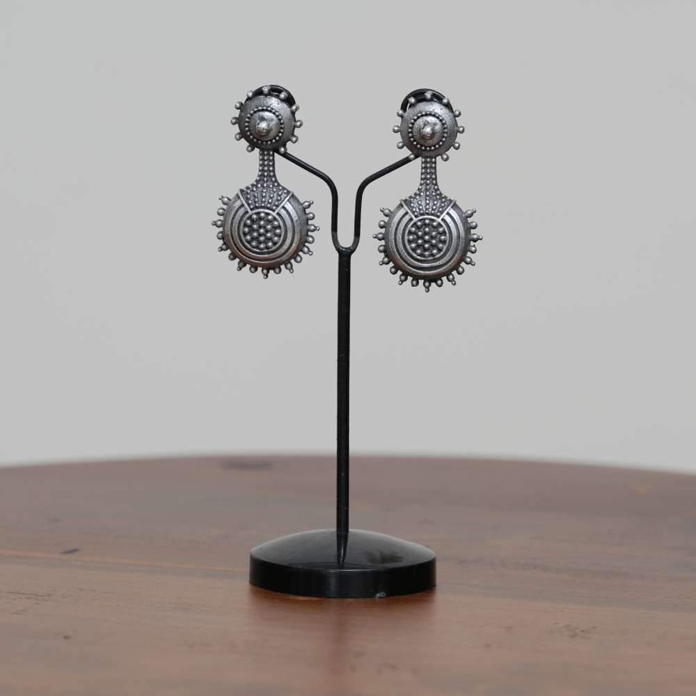 Oxidised silver circular stud-drop earrings with intricate traditional detailing.