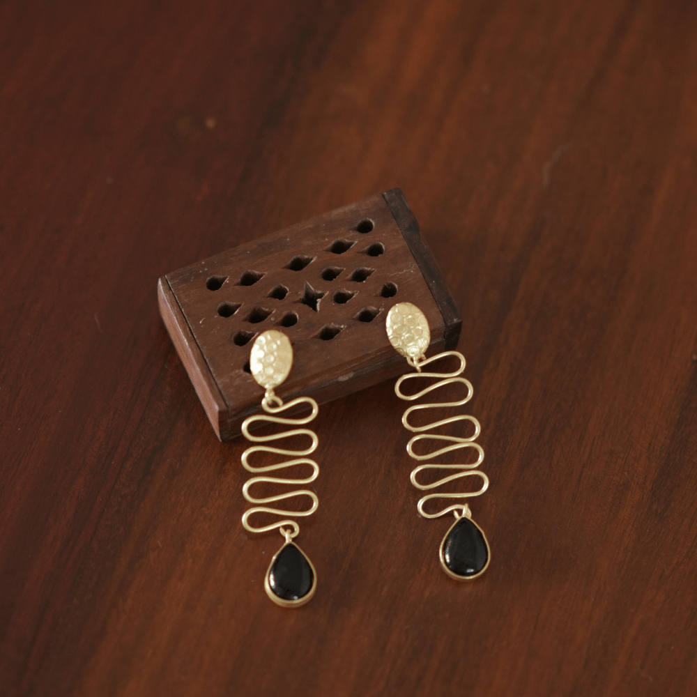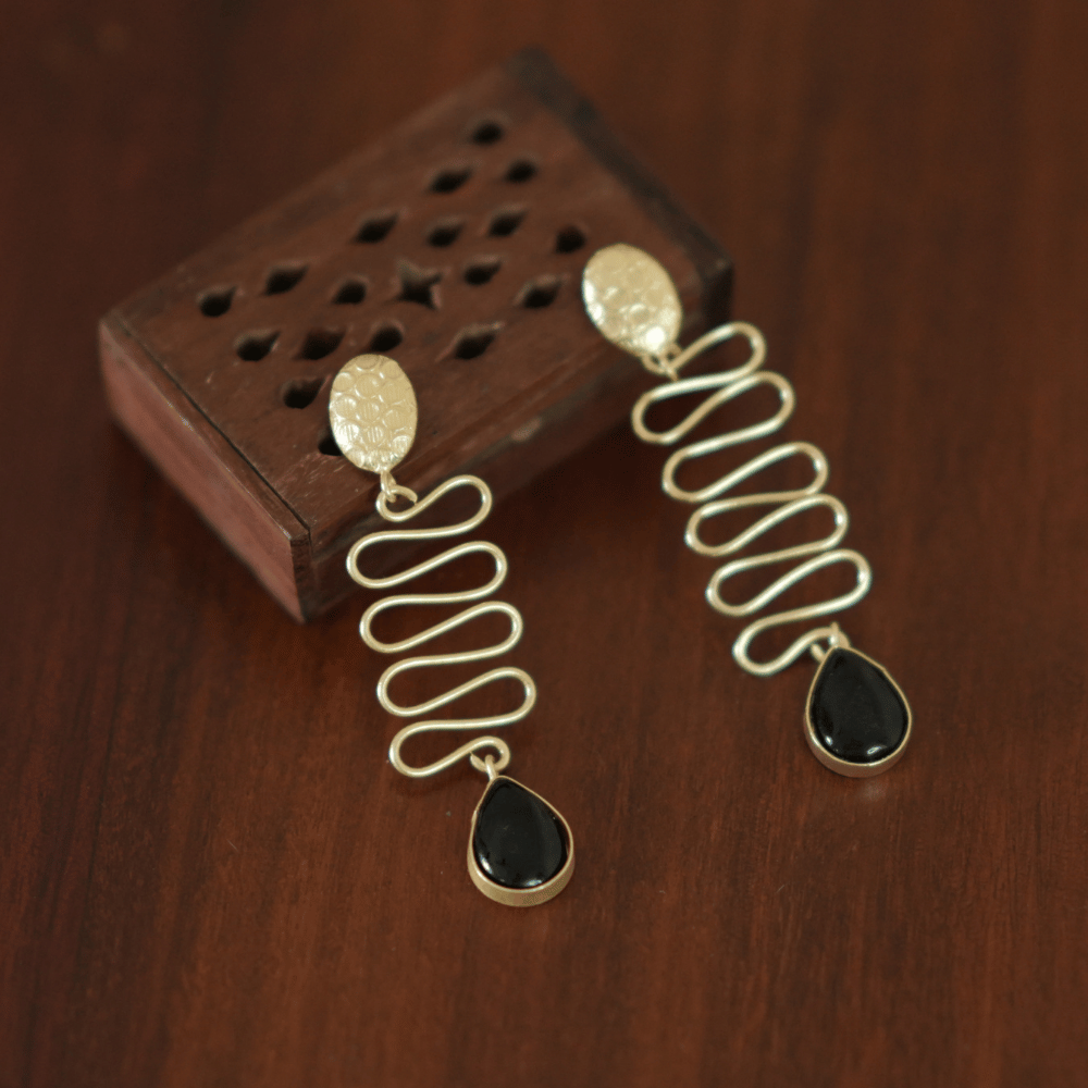 Step into the spotlight with the Midnight Wave Earrings – a modern masterpiece of bold design. Crafted with sleek golden waves that flow effortlessly into a striking black teardrop stone, these earrings embody both movement and mystery. Perfect for women who love statement jewelry that turns heads, they balance artistic flair with timeless sophistication.