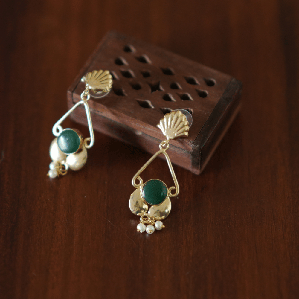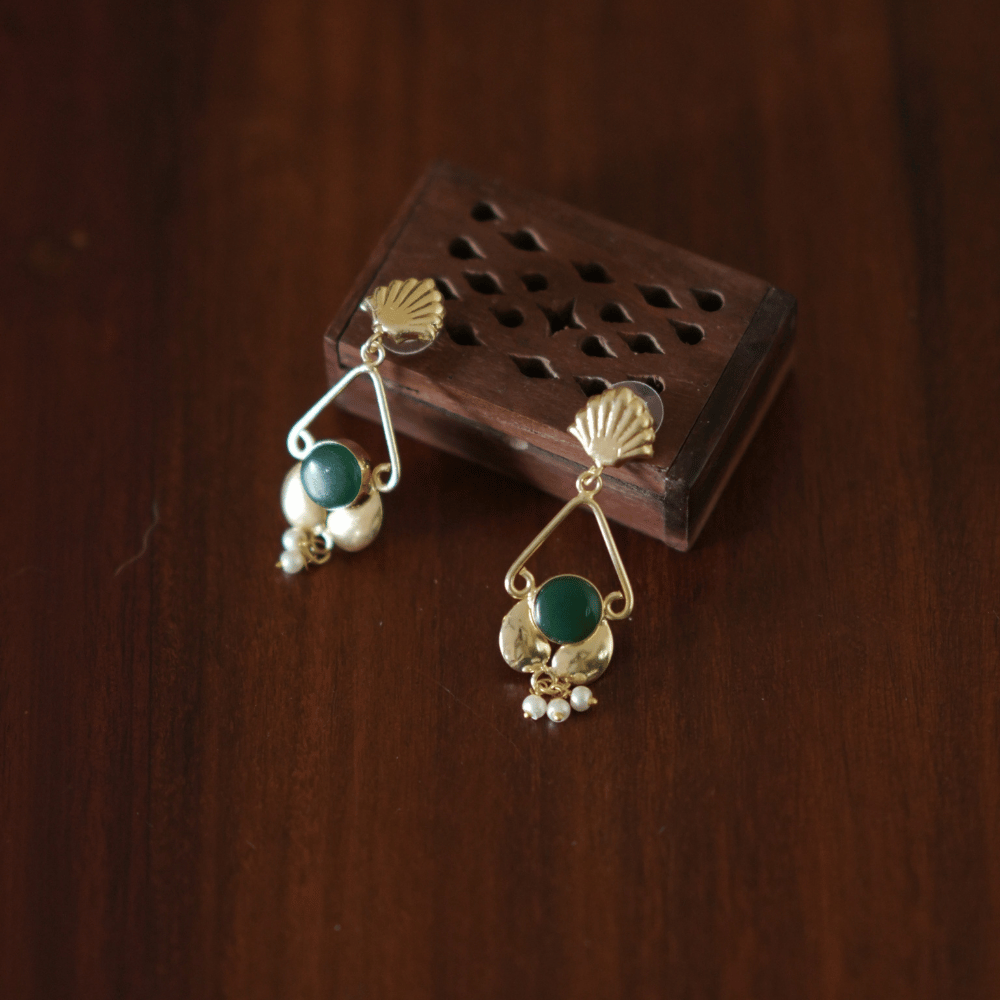 Embrace the beauty of nature and luxury with these Emerald Seashell Earrings. Designed with a radiant gold-tone shell stud, a striking green stone centerpiece, and delicate pearl drops, these earrings bring together the essence of the sea and the richness of tradition. Perfect for women who love statement jewelry that tells a story of grace and charm.