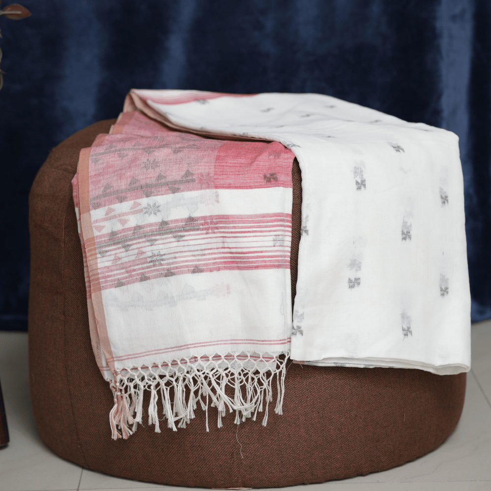 White and Dusty Red Handloom Cotton Saree with Subtle Motifs