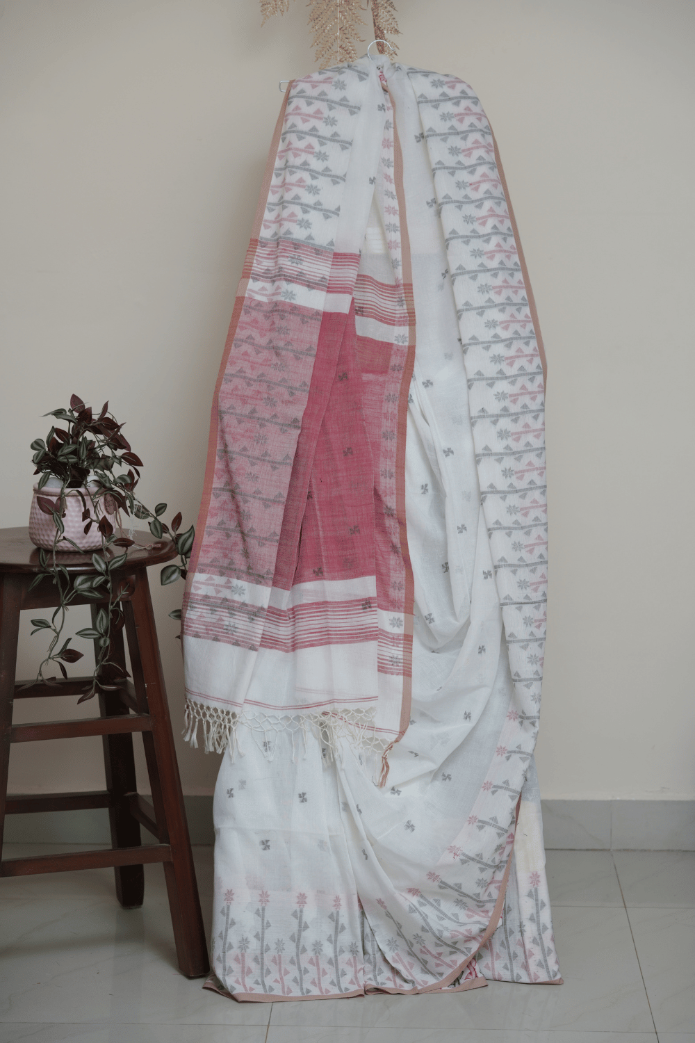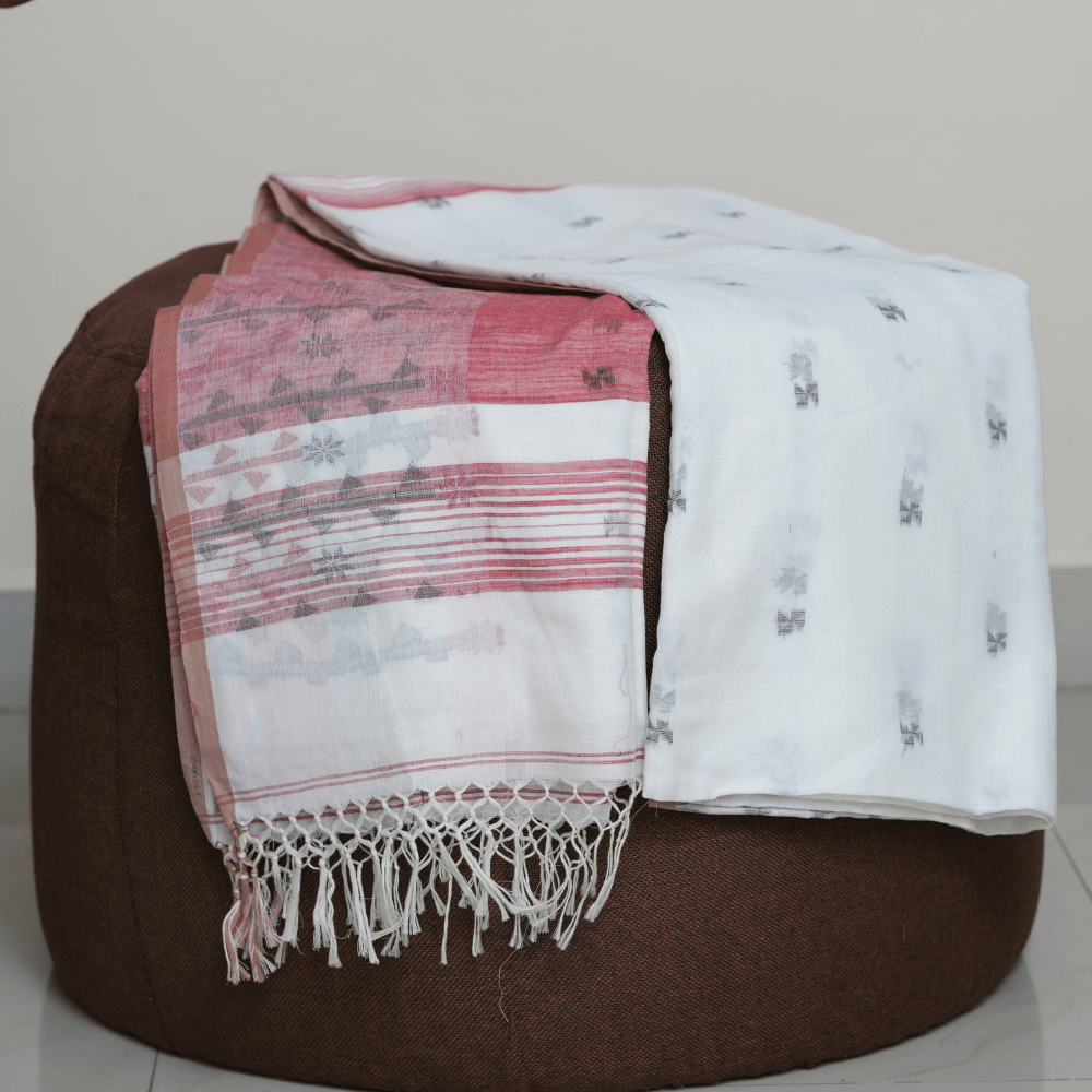 A graceful handloom cotton saree in pristine white, highlighted with delicate woven grey motifs across the body. The dusty red pallu with traditional woven patterns adds a soft yet striking contrast, while the beige-toned borders and dainty tassels complete the elegant finish. Lightweight and breezy, this saree is ideal for cultural gatherings, daytime occasions, and classy casual wear.