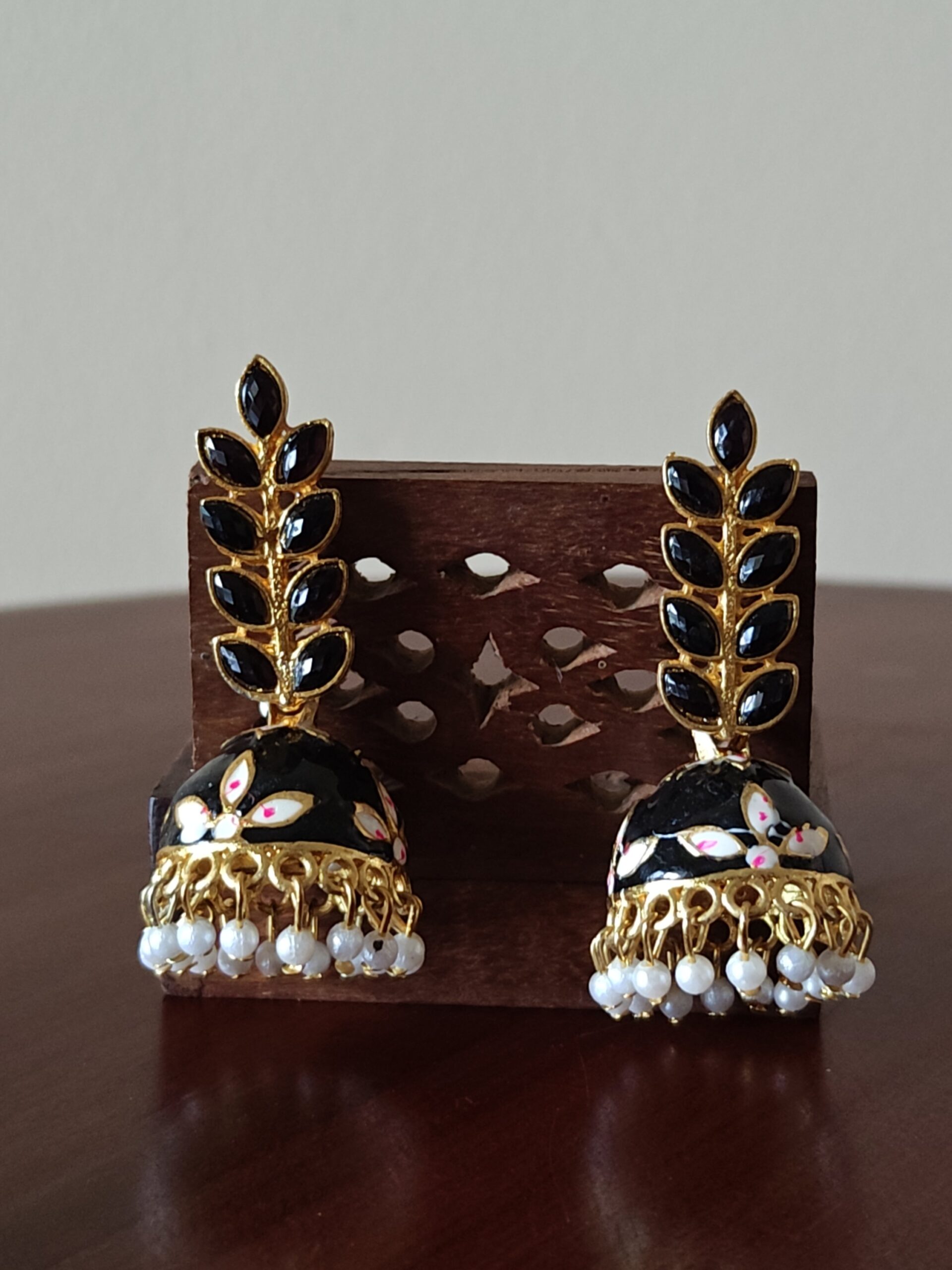 The matching jhumka dome is beautifully detailed with glossy black enamel accented by delicate floral patterns, giving the design a rich and artistic appearance. The base is finished with soft pearl danglings, adding gentle movement and timeless charm.