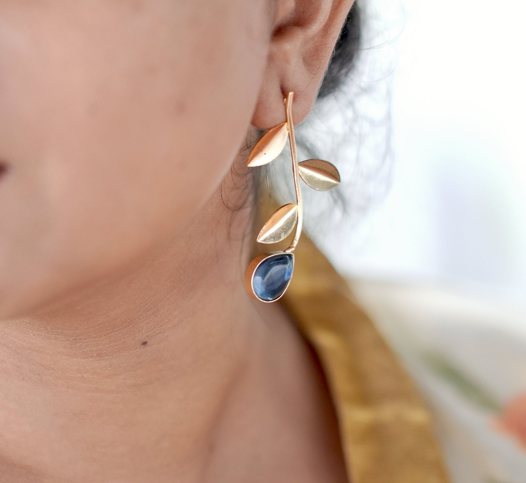 Embrace nature-inspired minimalism with these elegant drop earrings. The design features a smooth, polished gold-plated vine with two stylized leaves curving gracefully downward. Dangling from the vine is a sleek, teardrop-shaped Dark Navy Blue cabochon stone. These earrings offer a refined, subtle statement that is lightweight and effortlessly modern.