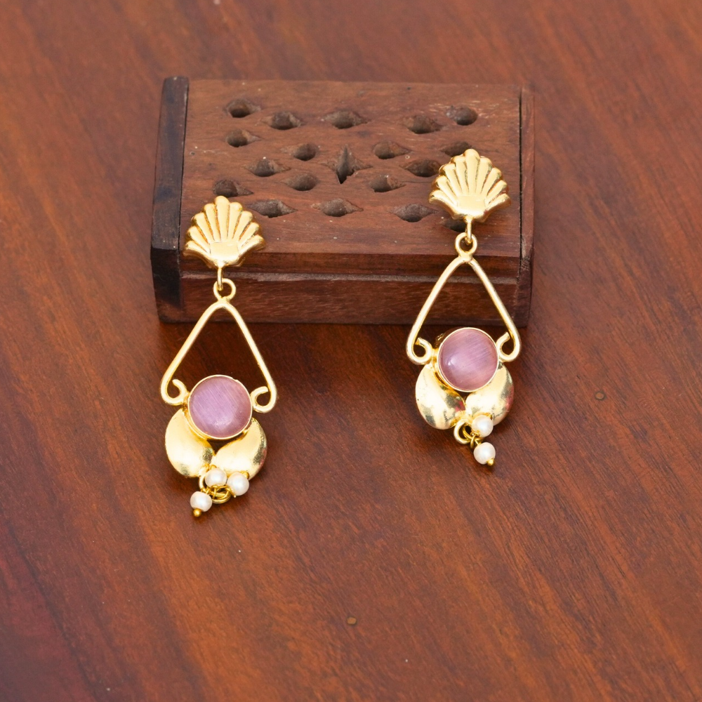 Soft femininity meets sculptural design. Featuring a delicate blush-pink round stone set against gold-toned curved elements, these drop earrings are finished with subtle pearl detailing for gentle movement. The open triangular frame and shell-inspired stud add an artistic touch, making the design both modern and timeless.