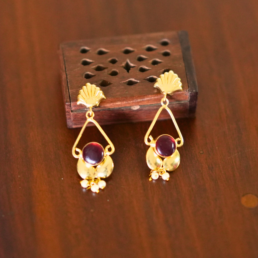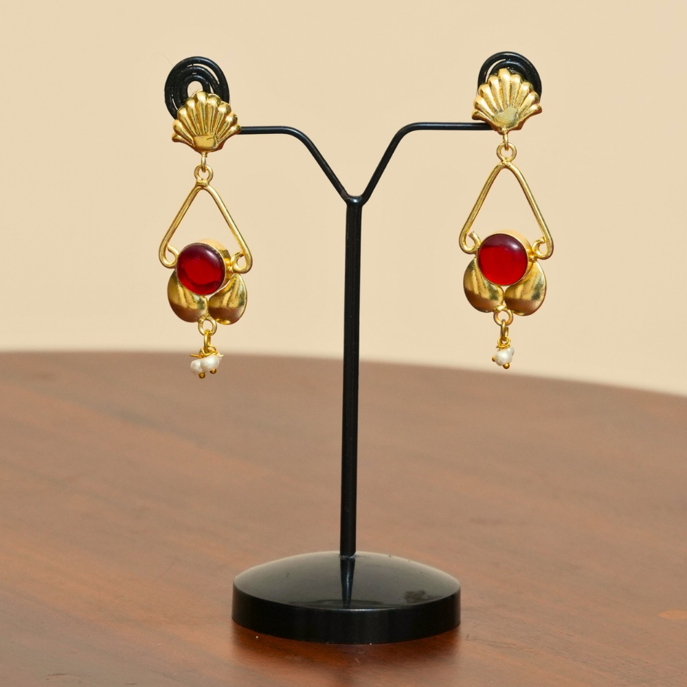 Bold geometry meets artisanal charm. Featuring a rich red circular stone suspended within a gold-toned triangular frame, these statement earrings are finished with sculpted floral accents and a delicate pearl drop. The design balances structure and softness, making it both eye-catching and elegant.