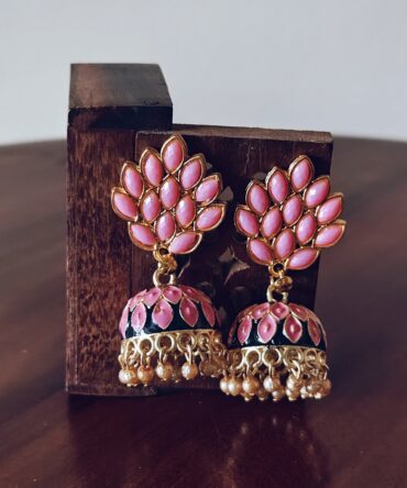 Blush Pink Lotus Meenakari Jhumka Earrings — Elegant Festive Jewelry