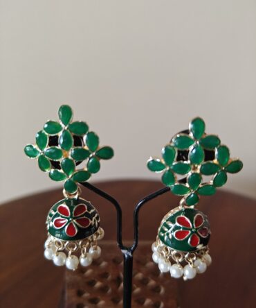 Emerald Green Meenakari Floral Pearl Jhumka Earrings — Traditional Festive Jewelry