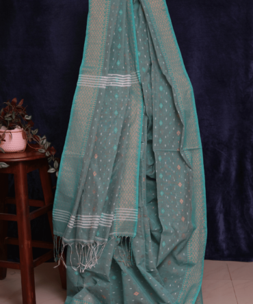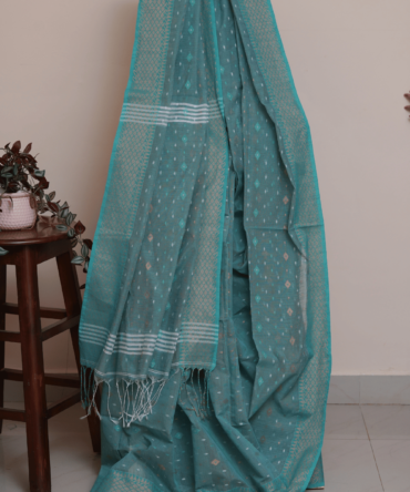 Tropical Teal Blue Soft Cotton Handloom Saree with White Thread Weaving
