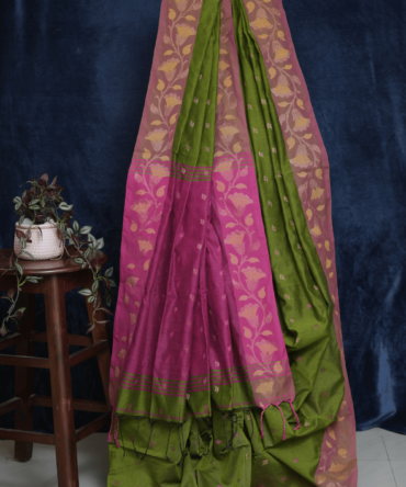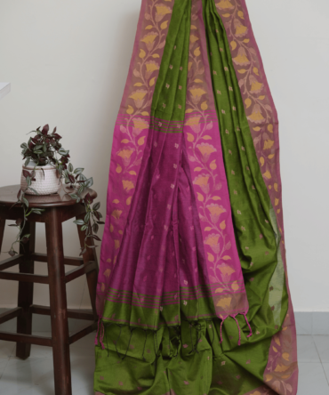 Kelly Green Soft Cotton Handloom Saree with Rani Pink Contrast Pallu