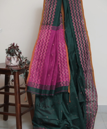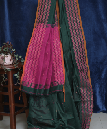 Bottle Green Handloom Cotton Saree with Magenta Pallu and Zigzag Zari Border