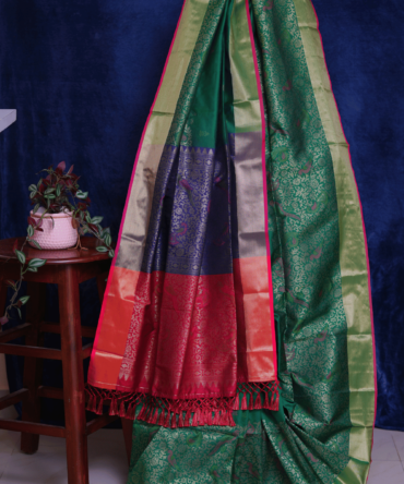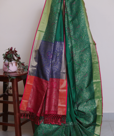 Emerald Green Soft Silk Saree with Multicolor Pallu and Golden Zari Weave