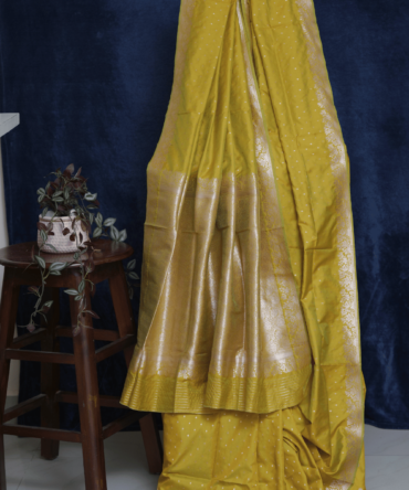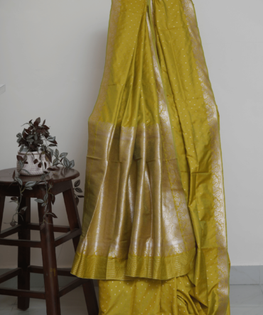 Olive Yellow Soft Silk Saree with Golden Zari and Subtle Dotted Weave