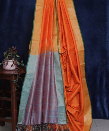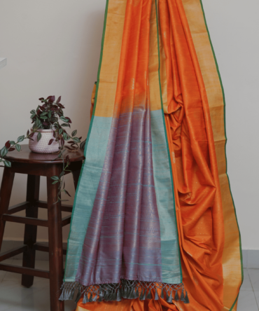 Orange Silk Saree with Subtle Green Border and Dual-Tone Pallu