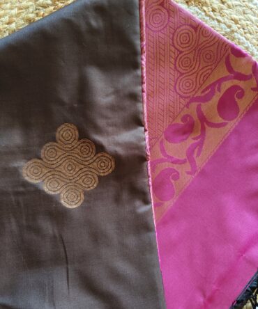 Chocolate Brown & Rani Pink Zari Butta Soft Silk Saree — Elegant Contrast Traditional Weave
