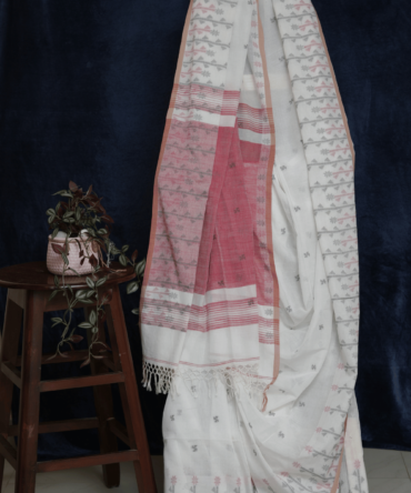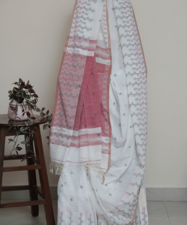 White and Dusty Red Handloom Cotton Saree with Subtle Motifs