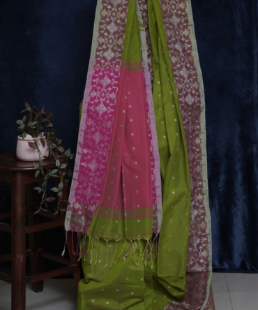 Olive Green Handloom Cotton Saree with Rani Pink Border and Floral Zari Weave