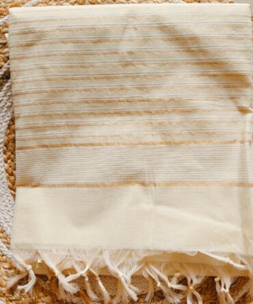 Off-White Golden Stripe Kerala Cotton Saree — Classic Temple Elegance